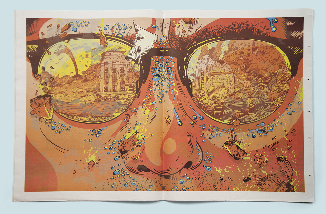 When the artwork is printed right across the page with no central margin or gutter, it's a double-page spread or DPS for short. The double-page spread in the middle of a newspaper or magazine is the centrespread.